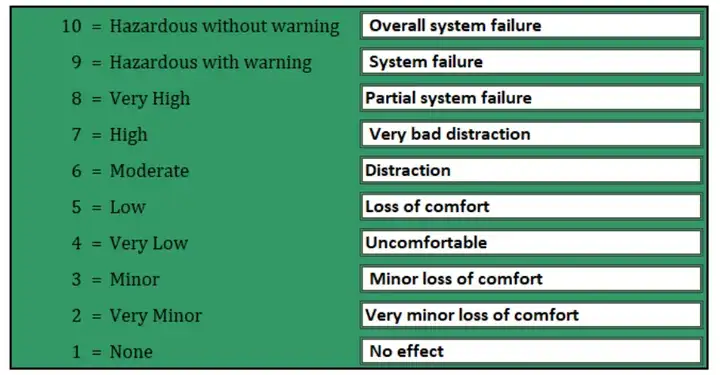 現在是時候為每種失效模式分配嚴重程度等級了。這是一個從1到10的相對等級,其中10表示影響可能在沒有警告的情況下產生危害,而1表示嚴重程度極低。AIAG(汽車工業行動小組)指南建議定制每個等級,以方便每個組織使用。FMEA團隊提出的CAN總線線束自適應嚴重程度等級可以在圖10中看到。