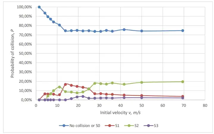 (橫坐標為初始速度 v(米 / 秒),范圍為 0-80;縱坐標為碰撞概率 P(%),范圍為 0%-100%;圖例中:No collision or S0 - 無碰撞或 S0 級傷害,S1-S1 級傷害,S2-S2 級傷害,S3-S3 級傷害)。