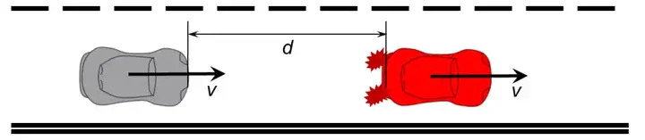 圖 4 所示場景的具體情況如下:在直線路段上,兩輛汽車以距離 d 同向、同速 v 行駛,前方車輛搭載有自動緊急制動系統(AEB)。在某一時刻 t?,前方車輛的 AEB 系統被激活,車輛以最大負加速度(制動加速度)a 進行制動。該場景下的負面后果是,后方車輛可能會與前方車輛發生碰撞 —— 因為后方車輛的駕駛員可能無法對前方車輛速度的突然變化做出及時反應,而此類碰撞可能導致人員傷亡。