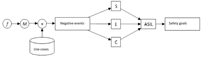 在該流程中,f 代表所研究系統的功能列表,M 代表功能故障(失效)列表。通過分析車輛在不同場景下出現不同類型故障時的表現,確定可能產生的負面后果;隨后,根據后果的嚴重程度(Severity, S)、駕駛員和乘客處于可能發生該后果狀態下的時間(暴露時間,Exposure, E)以及駕駛員避免該后果的能力(可控性,Controllability, C),對這些后果進行分類。接著,利用 ISO 26262-3 標準中的表格確定適用于所選場景下該失效的汽車安全完整性等級(ASIL)。分析的最終結果是一份帶有相應 ASIL 等級的安全目標列表。在此過程中,場景采用自然語言描述,對嚴重程度(S)、暴露時間(E)和可控性(C)的分類則基于評估得出。