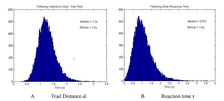 B. 駕駛員反應時間 τ(中位數 = 0.97 秒,85 百分位數 = 1.6 秒)