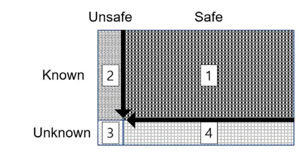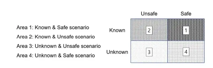在這種情況下,我們能夠預想到的 “前方車輛突然停車” 這一情況可被稱為 “已知因素(Known factor)”,而由于該情況可能引發事故,所以又可將其稱為 “不安全因素(Unsafe factor)”。(2)歸根結底,由于無法考慮到所有可能的情況,因此如圖 2 所示,應逐步減少圖 1 中 Area 3 所對應的 “未知且不安全的因素(Unknown & Unsafe factor)”,以此將因考慮不周而產生的不安全場景(而非技術層面的局限)降至最低。