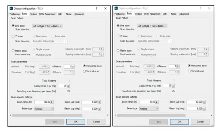 每個場景中所應用的傳感器和 ADAS 算法,均是對 Prescan 軟件自帶的演示模型(DEMO)進行修改后得到的結果。本研究中,使用了 Prescan 中模擬雷達(RADAR)傳感器的 TIS(技術無關傳感器),不過根據使用需求,也可選用攝像頭(CAMERA)、激光雷達(LIDAR)等其他類型的傳感器。此外,本研究在仿真中應用的 ADAS 功能為 AEBS,但除 AEBS 外,也可應用自適應巡航控制(ACC)、車道保持輔助系統(LKAS)等其他 ADAS 算法進行仿真。
