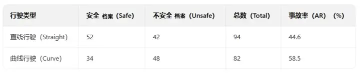 表 6 展示了不同行駛類型的仿真結果。其中,直線行駛(Straight)場景有 94 個,包含左轉 / 右轉及車道變更的曲線行駛(Curve)場景有 82 個。直線行駛場景的事故率為 44.6%,曲線行駛場景的事故率為 58.5%。同理,曲線行駛場景的事故率比直線行駛場景高出約 14.2%,因此曲線行駛場景也可能屬于不安全因素(Unsafe factor)。