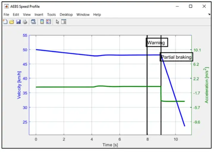 圖 7 記錄了搭載 AEBS 的車輛在行駛過程中速度和加速度的變化情況。該場景設定為:本車行駛速度高于前方車輛,兩車之間的距離逐漸縮短。仿真結果顯示,AEBS 在行駛開始后 8 秒發出警報(Warning),在行駛開始后 9 秒啟動部分制動(Partial Braking)。根據表 4 可知,警報(Warning)對應的 TTC 值與部分制動(Partial Braking)對應的 TTC 值相差 1 秒,而仿真中兩者的時間間隔也恰好為 1 秒,這表明 AEBS 正常工作,仿真結果具有合理性。