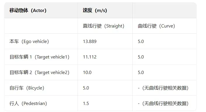 本研究以城市道路行駛為基準構建場景,因此對本車、對方車輛、自行車、行人等移動物體(Actor)的速度按表 3 進行定義。