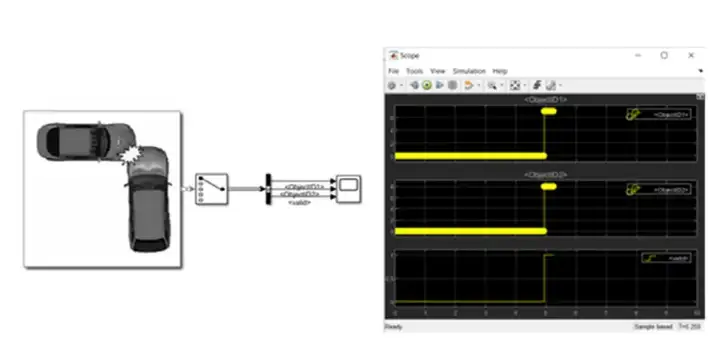 本研究采用 Prescan 軟件中的碰撞檢測功能(Collision detection)來判定事故是否發生。如圖 8 所示,在正常行駛(無碰撞)狀態下,該功能輸出值為 0;當本車與其他物體發生接觸(碰撞)時,輸出值變為 1。Prescan 會為每個物體(Object)分配唯一的 ID 編號(ID number),通過碰撞檢測功能識別到的 ID 編號,能夠確定與本車發生接觸的具體物體。