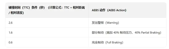 該 AEBS 的工作條件依據碰撞時間(TTC)進行劃分,具體劃分標準如下表 4 所示。TTC 指的是本車與對方車輛發生碰撞前剩余的時間,其計算方式為:本車與對方車輛之間的相對距離除以兩者的相對速度。如表 4 所示,AEBS 的工作條件劃分依據為 TTC 值,而控制變量則為制動壓力(Braking pressure)。