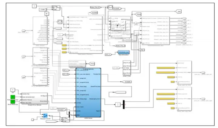圖 6 為在 MATLAB/SIMULINK 軟件中最終完成的 AEBS 模型。由于 Prescan 可在 MATLAB/SIMULINK 環境中運行,因此能夠利用傳感器采集到的周邊環境信息構建控制算法。
