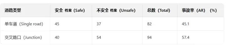 分析表 5 可知,在 176 個場景中,82 個場景為無交叉路口(Junction)的單車道場景,94 個場景為包含環島、道路合流點等的交叉路口場景。若將每種場景中發生事故的比例定義為事故率(AR),則單車道(Single road)場景的事故率為 45.1%,交叉路口場景的事故率為 57.4%。這一結果表明,交叉路口場景的事故率比單車道場景高出約 12.3%,因此交叉路口場景可能屬于不安全因素(Unsafe factor)。