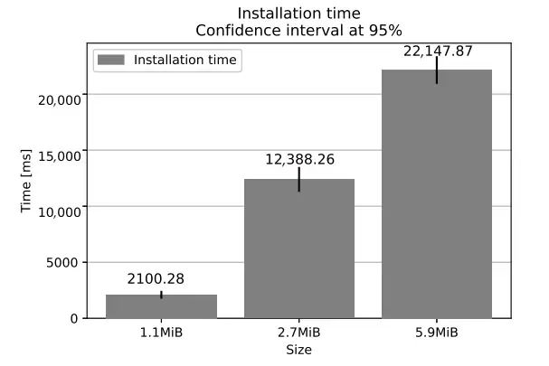 圖 6 顯示,大小約為 6.9 KiB、2.7 MiB 和 5.9 MiB 的軟件安裝包,其平均安裝時間分別為 2100 毫秒、12388 毫秒和 22148 毫秒。