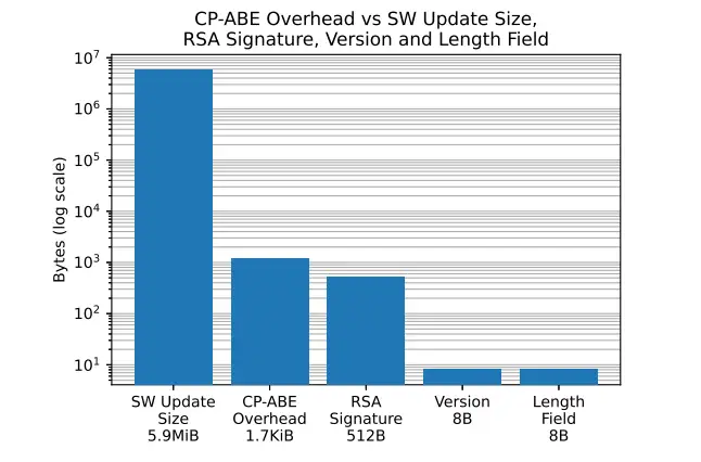 與 RSA 簽名相比,CP-ABE 密文的大小是其三倍多。但與軟件更新文件本身的大小相比,CP-ABE 密文所增加的額外數(shù)據(jù)量幾乎可以忽略不計。正因如此,為了在同一圖表中同時展示兩者的大小,我們不得不采用對數(shù)坐標。