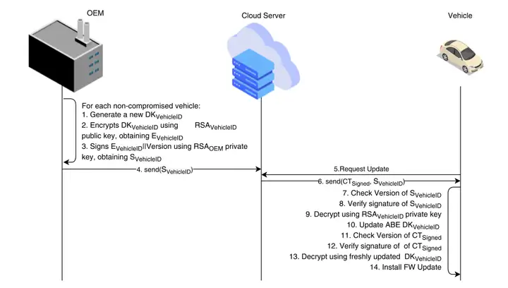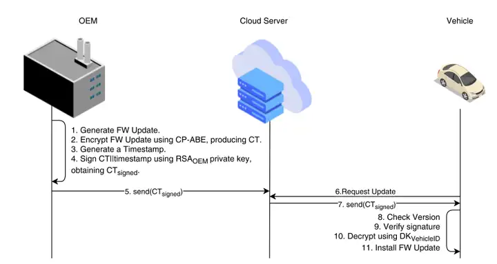 另一個問題在于,即便通過建立安全通道(如傳輸層安全協(xié)議 TLS)來實現(xiàn)更新文件的機密傳輸,但當更新文件處于 “靜態(tài)存儲” 狀態(tài)時,其機密性便無法得到保障。“靜態(tài)存儲” 指的是數(shù)據(jù)未在互聯(lián)網(wǎng)中傳輸,例如存儲在云服務器中的數(shù)據(jù)就處于靜態(tài)存儲狀態(tài)。這意味著,若制造商借助安全通道保障更新文件的機密性,就無法使用第三方不可信服務器來存儲和分發(fā)更新文件,因為當更新文件上傳到這類服務器時,它將處于未加密狀態(tài)。此外,即便制造商使用自家的可信云服務器向每輛車傳輸更新文件,一旦更新文件到達車輛的網(wǎng)關(guān),仍有可能被篡改網(wǎng)關(guān)的人員輕易截獲。