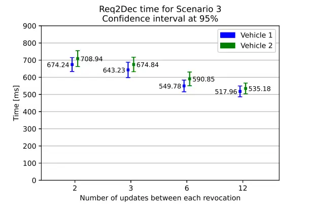 在確定密鑰撤銷頻率時,我們參考了特斯拉(Tesla)車輛的更新頻率數(shù)據(jù)。根據(jù)其官方網(wǎng)站信息,2020 年 1 月至 2020 年 11 月期間,特斯拉共發(fā)布了 122 次更新,平均每月發(fā)布超過 11 次更新。基于此,我們設置了四種不同的密鑰撤銷頻率(大致涵蓋從每周到每月的范圍),分別為:每 2 次更新執(zhí)行一次撤銷、每 3 次更新執(zhí)行一次撤銷、每 6 次更新執(zhí)行一次撤銷以及每 12 次更新執(zhí)行一次撤銷。