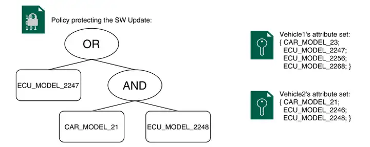 加密策略的具體含義為:“車輛若要訪問該更新數(shù)據(jù),必須滿足以下兩個條件之一:(1)具備 ECU_MODEL_2247 屬性;(2)同時具備 CAR_MODEL_21 屬性和 ECU_MODEL_2248 屬性”。
