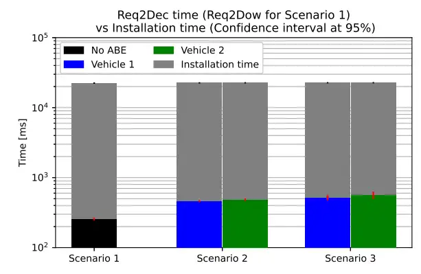 從場景 2 和場景 3 與場景 1 的耗時對比來看,CP-ABE 似乎對 OTA 軟件更新過程的耗時產(chǎn)生了不可忽視的影響。但當我們將這些耗時與實際的軟件安裝時間進行對比時,會發(fā)現(xiàn) CP-ABE 所增加的耗時其實是可以忽略不計的。