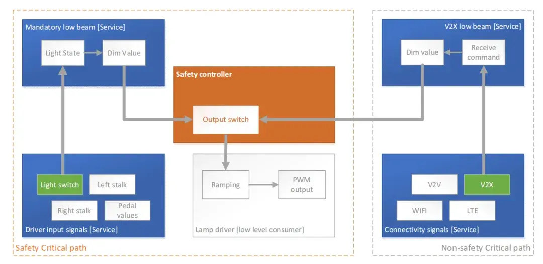 這兩個服務由一個監控安全機制(例如通過虛擬機監控程序或專用安全控制器)進行監控和管理。關鍵的是,車與萬物互聯(V2X)服務在非安全關鍵路徑中運行,以確保它不會影響必須始終滿足 ASIL-B(或更高)安全標準的強制類近光服務。輸出仲裁邏輯(即輸出開關或多路復用器)也必須包含在安全路徑中,以保證在所有條件下的一致和可觀察行為。這種架構分離具有以下關鍵優勢: