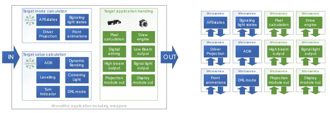 與此同時,即使對于高清投影等復雜功能,照明系統也正朝著無軟件設計的方向發展,從而降低硬件成本和復雜性。這些架構變革直接影響軟件設計:單體式照明應用必須演進為模塊化、面向服務的架構。我們的方法并非將所有功能整合到單個電子控制單元(ECU)中,而是主張將照明功能分解為微服務。圖 1 左側展示了當前的技術現狀,右側則呈現了未來的理想架構。這種方法支持靈活部署、提高可維護性,并更好地與未來軟件定義汽車(SDV)生態系統保持一致。面向服務的架構(SOA)原則可以逐步應用 —— 從基于域的系統到完全集中式架構 —— 提供可擴展性和長期適應性。