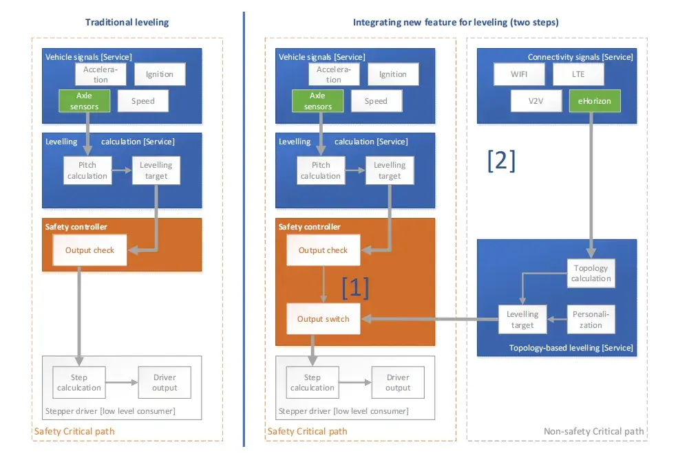 作為娛樂類別的代表性應用場景,我們研究了一種旨在增強個性化和用戶體驗的拓撲依賴式調平功能。傳統上,前照燈調平功能作為固定邏輯服務實現,基于預定義的車輛參數計算步進電機驅動程序的目標角度。這一核心功能通常是靜態的且經過安全驗證,幾乎沒有個性化或動態自適應的空間。相比之下,拓撲依賴式調平服務引入了新的以用戶為中心的定制層。例如,系統可以根據車輛當前位置(如城市道路與鄉村道路)、駕駛模式甚至駕駛員偏好來調整光束角度。為了在保留現有調平邏輯完整性的同時集成此功能,提出了以下基于面向服務的架構(SOA)的兩步法: