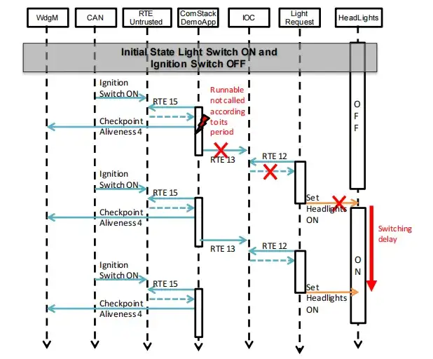 實驗?zāi)繕?biāo)如下:“ComStackDemoApp 必須通過非可信運行時環(huán)境(RTE)定期(10 毫秒)從 COM 模塊讀取點火開關(guān)位置”。失效模式 “周期過慢” 可能通過提供錯誤的點火開關(guān)位置,對 ASIL B 等級的燈光請求軟件組件(SWC)造成干擾。ComStackDemoApp 可能干擾前燈管理器的關(guān)鍵應(yīng)用程序,最終可能在系統(tǒng)層面違反安全目標(biāo) SG1 和 / 或 SG2。