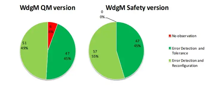 6% 的 “無觀察結(jié)果”(即 WdgM 未檢測到任何錯誤)與安全分析中識別的情況完全一致(表 1 中的 γ 類和 δ 類)。結(jié)果表明,這些情況已通過安全版本得到處理。此處的故障注入測試提高了對 WdgM 新實現(xiàn)所處理的錯誤檢測覆蓋率的信心。