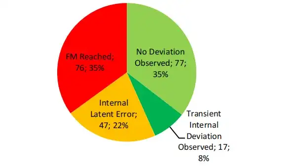 結(jié)果表明,基于安全分析的測試用例是有效的,僅有 35% 的測試 “未觀察到偏差”。結(jié)果還突顯了在實現(xiàn)方面需要做出的努力,重點關(guān)注導(dǎo)致失效模式的基本事件(紅色部分)和仍處于潛伏狀態(tài)的錯誤(橙色部分)。例如,可以建議對某些變量進行三重存儲,以通過多數(shù)投票對其進行保護。然而,需要在內(nèi)存消耗、性能和安全性之間進行權(quán)衡。