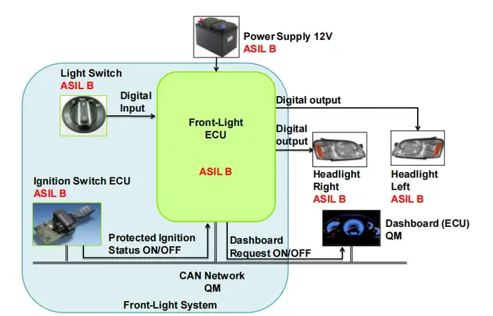 在一個簡單的汽車應(yīng)用(前燈系統(tǒng))上實現(xiàn)了該方法的概念驗證。該案例研究的軟件架構(gòu)基于 AUTOSAR 4.X。本文在不同開發(fā)層級描述了該系統(tǒng),并結(jié)合安全分析,展示了需求的可追溯性及其在故障注入指標(biāo)評估中的重要性。