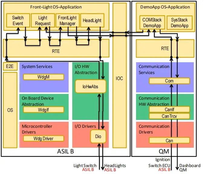 如無干擾(FFI)分析中所定義,系統(tǒng)包含兩個 OS - 應(yīng)用程序。可信 OS - 應(yīng)用程序管理安全關(guān)鍵功能(ASIL B),包括:四個軟件組件(開關(guān)事件、燈光請求、前燈管理器和前燈)、一個可信運行時環(huán)境(RTE)、系統(tǒng)服務(wù)(BSWM、WdgM)、輸入 / 輸出硬件抽象棧、IOC 和端到端(E2E)保護(用于解除燈光開關(guān)狀態(tài)的保護)。該 OS - 應(yīng)用程序運行軟件組件的關(guān)鍵可運行實體,其目的是收集燈光開關(guān)和點火開關(guān)的信息,并處理儀表盤指示器和前燈的狀態(tài)。