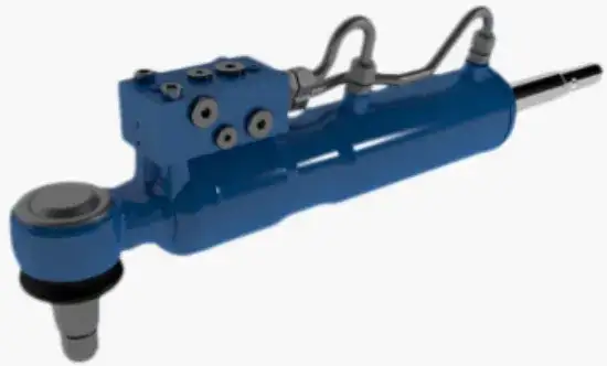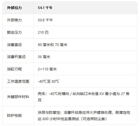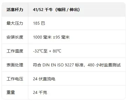 如圖 9 所示,該系統工作電壓為 24 伏直流電,需與車輛電池連接。此外,為減少不利影響,系統重量應盡可能小,因為若后橋轉向系統重量過大,最終將導致轉向力增加。活塞桿縮回時的作用力為 41 千牛,伸出時為 52 千牛,這表明活塞兩側的面積不同,即該后橋轉向系統采用的是單桿雙作用油缸。活塞桿的縮回和伸出長度均在 0.95 米以內,這將決定車輛后 / 隨動橋安裝該系統所需的連桿機構和平臺幾何結構。