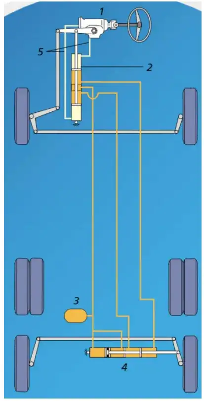 采用主從油缸和對中機構概念的后橋轉向系統設計于 20 世紀 90 年代問世,圖 3 展示了其中一個示例。