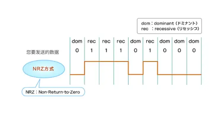 CAN 使用“NRZ(不歸零)方法”來轉(zhuǎn)換和傳輸待傳輸?shù)臄?shù)據(jù)。這種方法轉(zhuǎn)換起來相對簡單,因此被廣泛應(yīng)用于各種通信協(xié)議中。