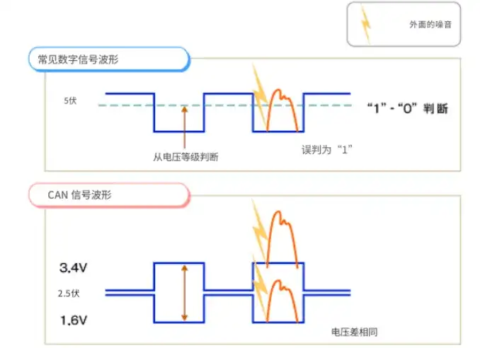 車載設(shè)備不可避免地會(huì)受到外部噪聲的影響,但 CAN 采用的方法使其不易受到此類影響,從而可以構(gòu)建高度可靠的網(wǎng)絡(luò)。