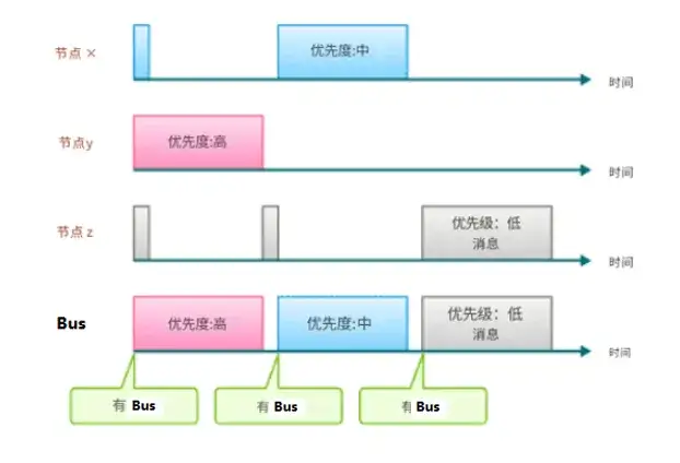 CAN使用“多主系統(tǒng)”,允許 線路結(jié)構(gòu)中連接的每個(gè)節(jié)點(diǎn)平等地訪問總線(注意)。
