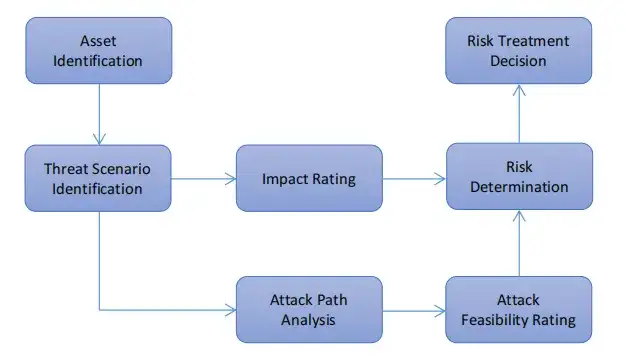 在汽車風險評估中,進行實際資產識別之前,必須先確定評估對象(TOE)或用例,以評估某個組件中的候選對象是否為真實資產。接下來是風險評估,即識別資產安全特性中的風險場景。根據 ENISA(歐洲網絡與信息安全局)的資產分類方法,汽車資源將分為八個子類別(即傳感器和執行器等),以評估項目中的候選對象是否為真實資產。在汽車風險評估中,資產識別之前也應確定評估對象(TOE)或用例。