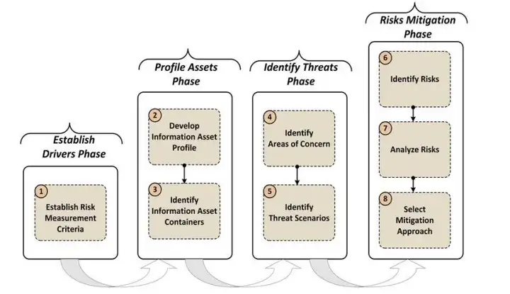 OCTAVE 方法將評估分為三個階段,旨在讓組織員工充分了解企業的網絡安全需求,在這些階段中,會對管理問題和技術因素進行評估與討論。OCTAVE 方法被描述為一種融合資產、風險和暴露評估的評估技術,它使管理層能夠利用評估結果選擇合適的策略,并對需要解決的威脅進行排序。此外,該方法還會考慮云服務提供商的使用情況及其對實現組織目標的貢獻。圖 2 展示了 OCTAVE 方法進行風險分析的階段。
