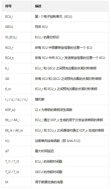 現(xiàn)代車輛具備更多功能,例如遠程信息處理、高級駕駛輔助系統(tǒng)和信息娛樂系統(tǒng)。因此,每輛車所需的 ECU 數(shù)量不斷增加,這些 ECU 需要在車載網(wǎng)絡(IVN)中執(zhí)行更多的計算操作。因此,設計一種在執(zhí)行各種操作時計算時間短且滿足重要安全需求的協(xié)議至關重要。我們提出一種安全數(shù)據(jù)傳輸方案(命名為 AutoSec),該方案采用 SHA-512、按位異或(⊕)和連接(||)運算,實現(xiàn)安全且經(jīng)濟高效的數(shù)據(jù)交換,保護關鍵信息免受各種安全威脅。AutoSec 結合輕量級運算(|| 和⊕)和 SHA-512,通過適當?shù)膮f(xié)議設計,在滿足 256 位安全級別的同時,快速完成各種計算。由于 AutoSec 旨在通過低成本的加密運算保護車載消息通信,因此不需要任何硬件修改和網(wǎng)絡改進。因此,所提方案可輕松應用于現(xiàn)有的 CAN 架構。AutoSec 主要包括兩個階段:(i)基本設置和(ii)消息通信協(xié)議。4.1 節(jié)討論基本設置過程,以在 ECU 中生成和加載長期密鑰。4.2 節(jié)詳細討論與 AutoSec 相關的安全通信協(xié)議。表 1 描述了 AutoSec 設計中使用的各種符號。