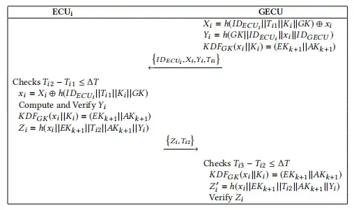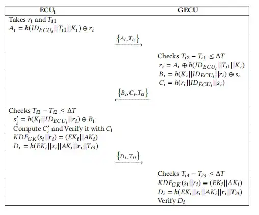 ECU_i 和 GECU 之間的會話密鑰會定期更新,以使用新計算的會話密鑰提高系統(tǒng)安全性。然而,若采用會話密鑰更新協(xié)議(SKUP),則所有連接的 ECU 都能輕易獲取 ECU_i 的新會話密鑰。因此,我們設計了一種增強的會話密鑰更新協(xié)議(SKUP),以解決當前會話密鑰更新過程中存在的這一問題。所提會話密鑰更新協(xié)議(SKUP)如圖 4 所示。