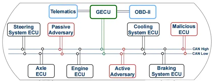 ?所有 ECU 都直接與網(wǎng)關 ECU(GECU)連接,而 GECU 與無線接口相關聯(lián)以實現(xiàn)不同功能,這使得攻擊者能夠向 CAN 總線注入錯誤消息。