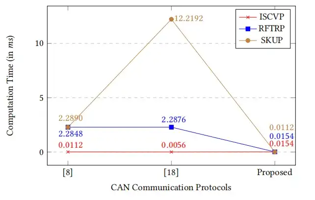 而 AutoSec 在初始會話密鑰計算與驗證協(xié)議(ISCVP)、遠程幀傳輸請求協(xié)議(RFTRP)和會話密鑰更新協(xié)議(SKUP)階段分別僅需要執(zhí)行 9T_h (?) + 2T_KDF、9T_h (?) + 2T_KDF 和 6T_h (?) + 2T_KDF。基于每個運算的平均執(zhí)行時間,我們計算了 Woo 等 [8]、帕拉尼瓦米等的方案以及 AutoSec 的計算時間,結果如圖 5 所示。由于 AutoSec 采用低成本且運算數(shù)量較少的設計,其計算時間相比方案更短。