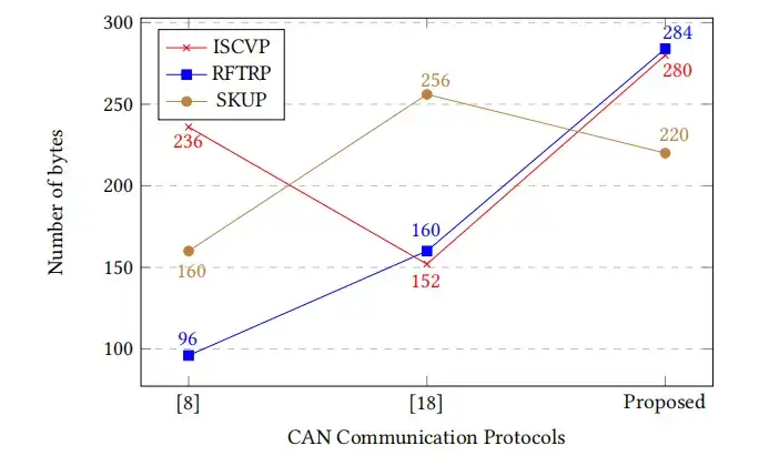 發(fā)送方和接收方都需要交換不同的開銷參數(shù),以執(zhí)行初始會話密鑰計算與驗證、遠程幀傳輸請求和會話密鑰更新(見 4.2 節(jié))。傳輸這些參數(shù)的成本稱為通信開銷(以字節(jié)為單位),根據(jù)每個協(xié)議期間參數(shù)的類型和所需數(shù)量計算。單向哈希(即 SHA-512 h (?))、AES 加密(AES)、橢圓曲線乘法(ECMP)、隨機數(shù) / 身份標識(RN/ID)和時間戳(TS)分別需要 64 字節(jié)、32 字節(jié)、64 字節(jié)、12 字節(jié)和 8 字節(jié)。在 AutoSec 中,初始會話密鑰計算與驗證協(xié)議(ISCVP)、遠程幀傳輸請求協(xié)議(RFTRP)和會話密鑰更新協(xié)議(SKUP)的通信開銷分別為 280 字節(jié) [4h (?) + 3TS]、284 字節(jié) [4h (?) + 1ID + 2TS] 和 220 字節(jié) [3h (?) + 1ID + 2TS]。方案在初始會話密鑰計算與驗證協(xié)議(ISCVP)中的通信開銷為 236 字節(jié) [3h (?) + 1RN + 1AES],在遠程幀傳輸請求協(xié)議(RFTRP)中的通信開銷為 96 字節(jié) [1h (?) + 1AES],在會話密鑰更新協(xié)議(SKUP)中的通信開銷為 160 字節(jié) [2h (?) + 1AES];而方案在初始會話密鑰計算與驗證協(xié)議(ISCVP)、遠程幀傳輸請求協(xié)議(RFTRP)和會話密鑰更新協(xié)議(SKUP)中的通信開銷分別為 152 字節(jié)(2h (?) + 2RN)、160 字節(jié) [2h (?) + 1AES] 和 256 字節(jié) [2h (?) + 2ECMP]。圖 7 展示了相關工作的通信開銷對比研究。[8] 的初始會話密鑰計算與驗證協(xié)議(ISCVP)中,種子值和隨機數(shù)通過 CAN 總線廣播,這些值用作密鑰計算和驗證的輸入,使得被攻陷的 ECU(基于廣播值)能夠在后續(xù)執(zhí)行惡意活動。