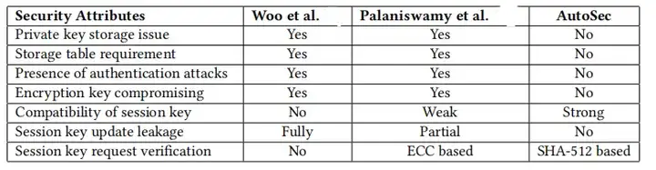 證明:我們假設攻擊者(A)想要通過充當 GECU,非法更新 ECU_i 和 GECU 之間的會話密鑰。因此,在這種情況下,ECU_i 充當挑戰(zhàn)者(C),以確認收到參數(shù)的真實性。攻擊者(A)需要計算 X_i [=h (ID_ECU_i || T_i1 || K_i || GK) ⊕ x_i] 和 Y_i [=h (GK || ID_ECU_i || x_i || ID_GECU)],以進行會話密鑰更新。我們假設攻擊者(A)作為內(nèi)部攻擊者獲取了 GK,但不知道 K_i(僅 ECU_i 和 GECU 知曉)。此外,攻擊者(A)需要 x_i 和 K_i 來計算 Z_i^A,以發(fā)送響應消息(即 {Z_i, T_i2}),用于會話密鑰更新確認。然而,GECU 將(GECU 端計算的)Z_i 與(攻擊者 A 發(fā)送的)Z_i^A 進行確認。若交互參數(shù)發(fā)生任何變化,則 Z_i 是否等于 Z_i^A 的驗證過程將失敗。因此,攻擊者(A)無法更新 GECU 和 ECU_i 之間的會話密鑰。表 2 總結了和 AutoSec 的對比分析,展示了不同屬性下的安全優(yōu)勢。方案基于組密鑰認證的概念,使得攻擊者能夠通過被攻陷的 ECU 發(fā)起認證攻擊。此外,由于第 i 次會話的加密密鑰對所有 ECU 都相同,會話密鑰可能會全部或部分泄露。而且,需要可信平臺模塊(TPM)來存儲關鍵值,而 AutoSec 不需要 TPM。由于 AutoSec 基于 SHA-512 構建,且每個會話中每個 ECU 的會話密鑰計算值都不同,因此 AutoSec 在各種安全屬性方面具有穩(wěn)健性。