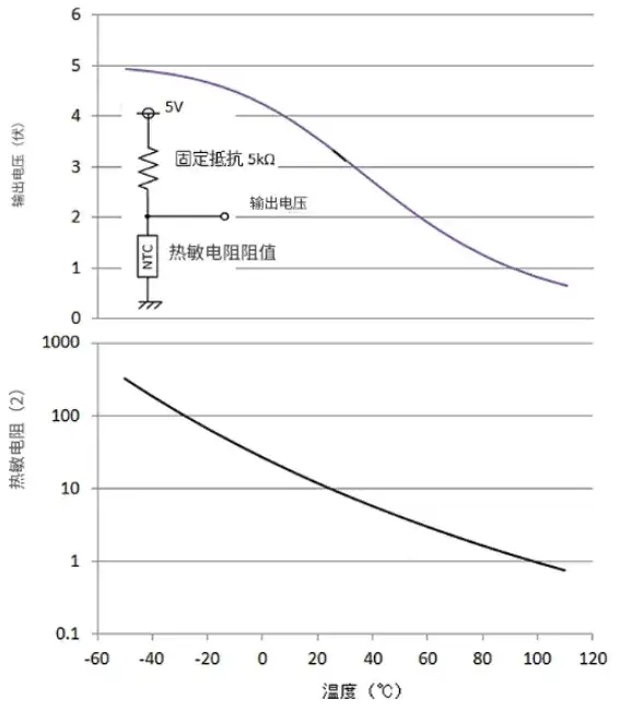 通過在 ECU 內部配置一個結合了熱敏電阻和電阻的測量電路,可以獲得如圖 8 上圖所示的溫度和電壓之間的關系。ECU 使用 AD 轉換器來測量該關系。