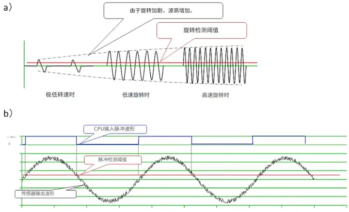 (4) 發動機極低速運轉時,例如啟動過程中,波高會變得非常小。波形也可能與正弦波不同(還受齒輪齒數和形狀的影響)。