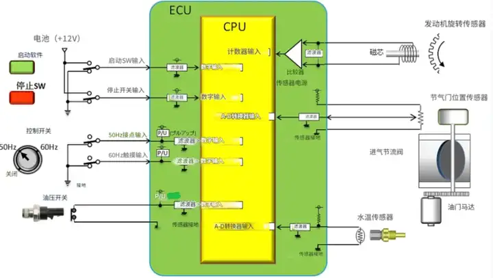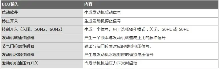 該發電機系統有三種類型的開關,一個用于發動機轉速傳感器信號的脈沖電路,以及用于節氣門位置傳感器和水溫傳感器的模擬電壓輸入。